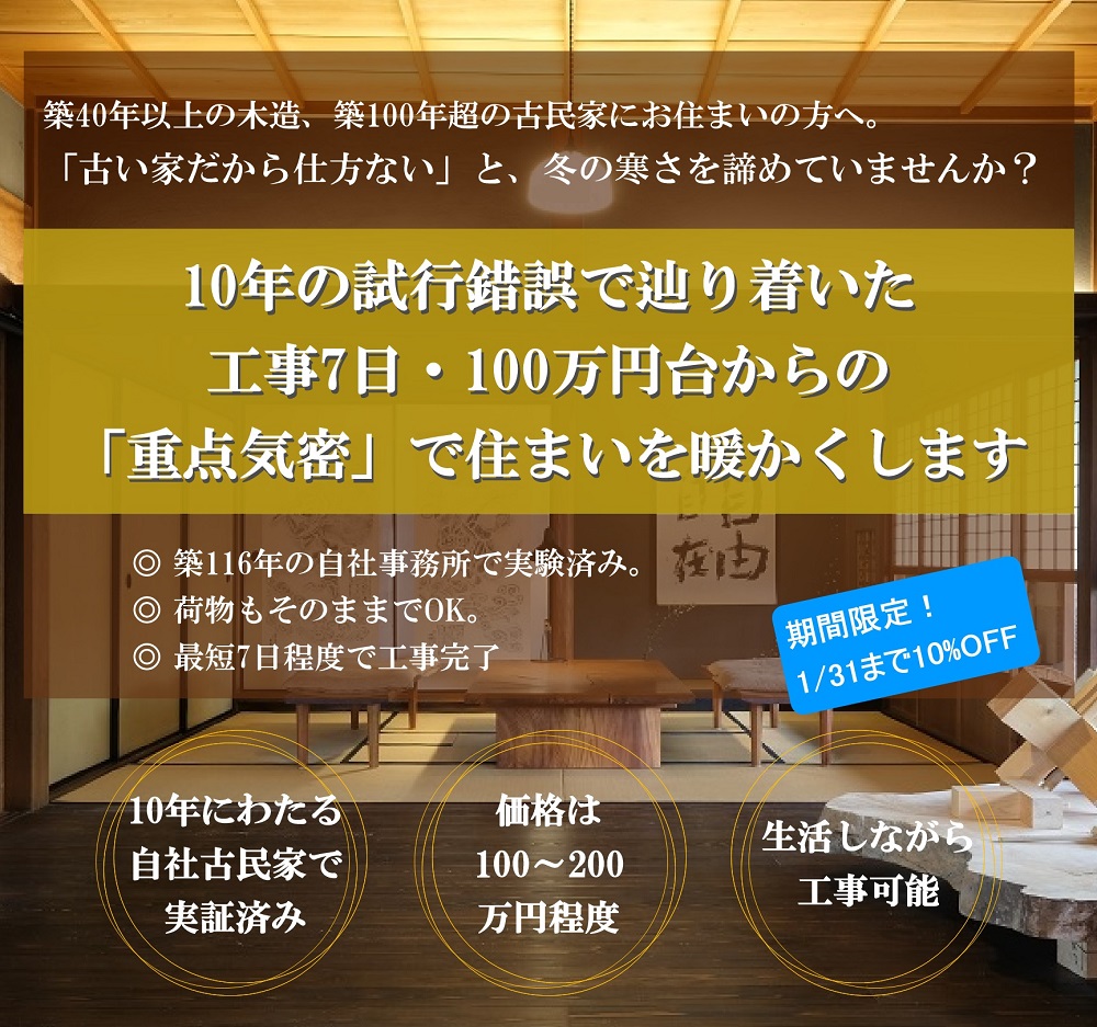 工事7日、100万円台~で、寒すぎる木造・古民家を暖かくします