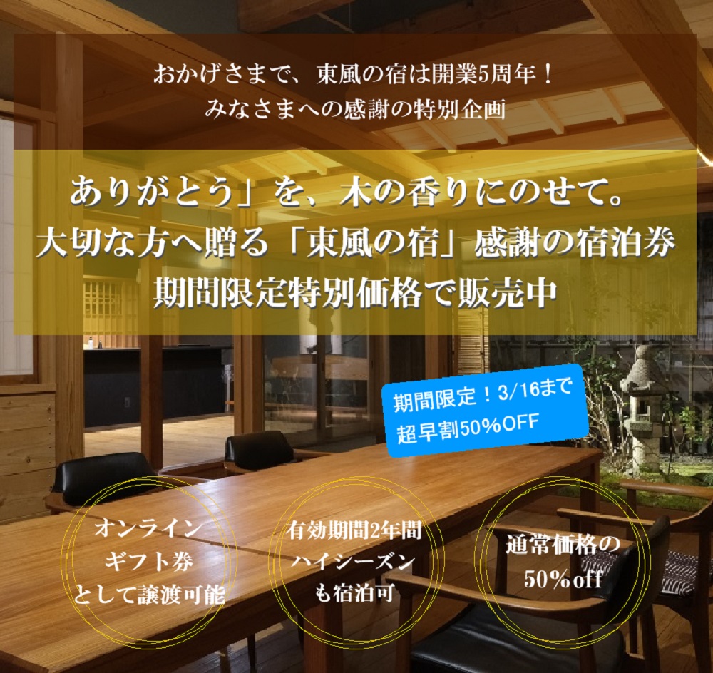 「ありがとう」を木の香りにのせて。「東風の宿」期間限定 感謝の宿泊券